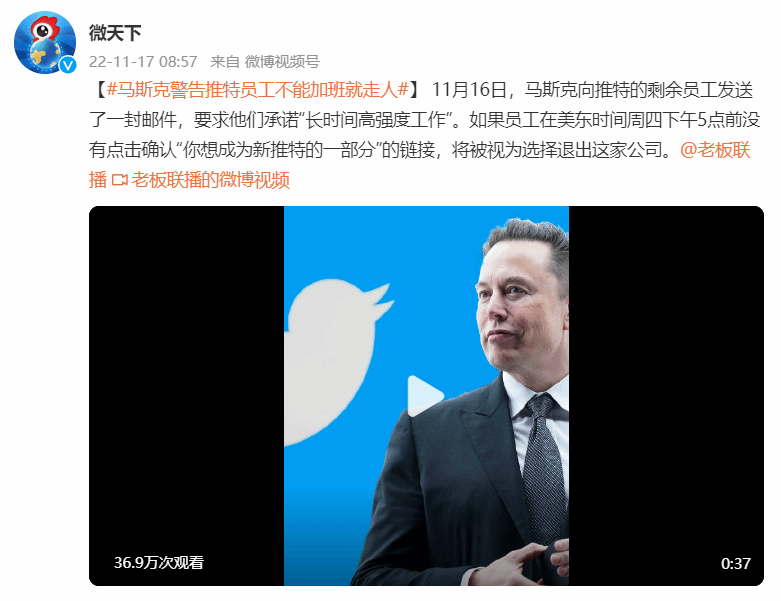 11月16日,马斯克向推特的剩余员工发送了一封邮件,要求他们承诺“长时间高强度工作”,否则将获得“三个月的遣散费”。如果员工在美东时间周四下午5点前没有点击确认“你想成为新推特的一部分”的链接,将被视为选择退出这家公司。