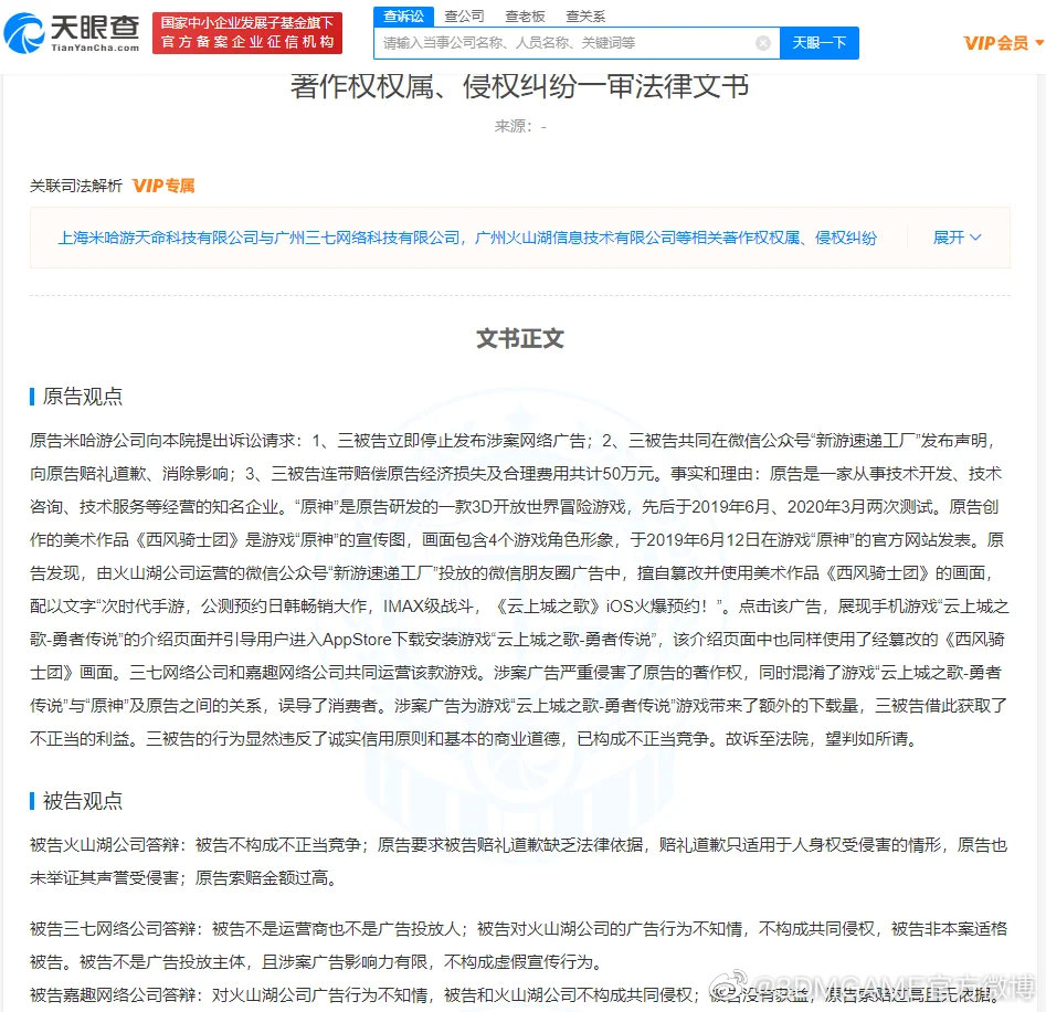 米哈游诉三七互娱抄袭《原神》获赔 被告赔偿3万!