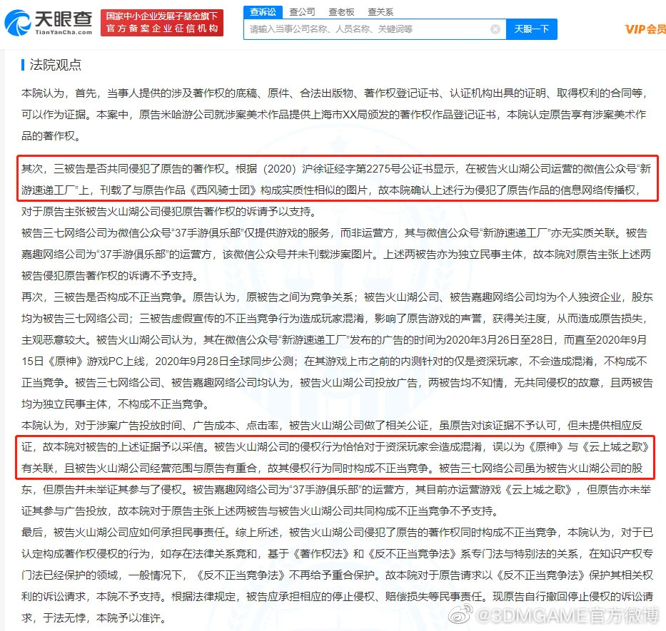 法院审理认为,被告火山湖公司在运营公众号上,刊载了与原告作品构成实质性相似的图片,侵犯了原告作品的信息网络传播权;同时被告侵权行为对资深玩家造成混淆,误以为《原神》与《云上城之歌》有关联,且公司经营范围与原告有重合,构成不正当竞争。最终,法院判决被告火山湖公司赔偿原告米哈游公司3万元。