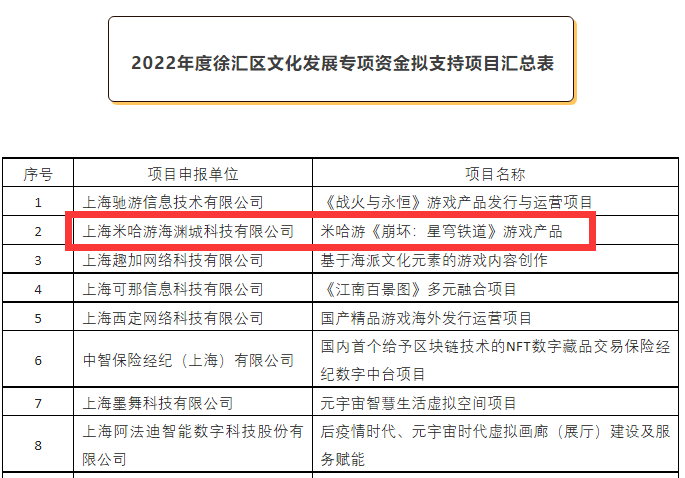 据微信公众号“徐汇文创”消息,上海徐汇区文化和旅游局对2022年度徐汇区“文化发展专项资金扶持项目评审结果”进行了公示,米哈游3D回合制策略RPG新作《崩坏:星穹铁道》位列其中。