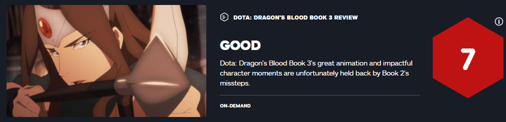 《DOTA:龙之血》第三季似乎也是系列的最后一季了,本季任务十分艰巨,它要将第二季中所呈现的混乱表现整合到一个故事中,它也很好地收拾了前作留下的烂摊子。本作有令人印象深刻的动画,角色也富有表现力,细节刻画也很到位,打斗场景大放异彩。尽管如此,本季依然受到前作糟糕表现的影响,在某些方面阻碍了故事的发展。如果工作室有更多的时间相信他们会做的更好。