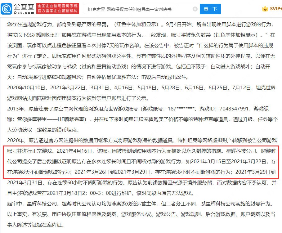 《坦克世界》玩家用脚本被封号还起诉官方 法院:连着玩8天不停人类做不到!