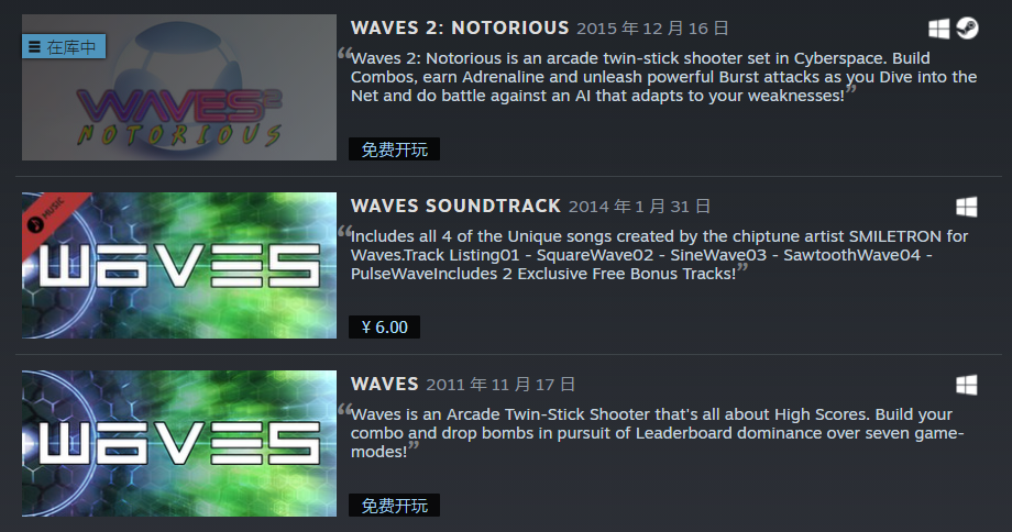Rob的第一款作品《波动》于2011年发布,这是一款画面异常绚丽的射击游戏。游戏可以拉长或拉短鼠标,来改变射击的距离,同时配乐也十分带感。