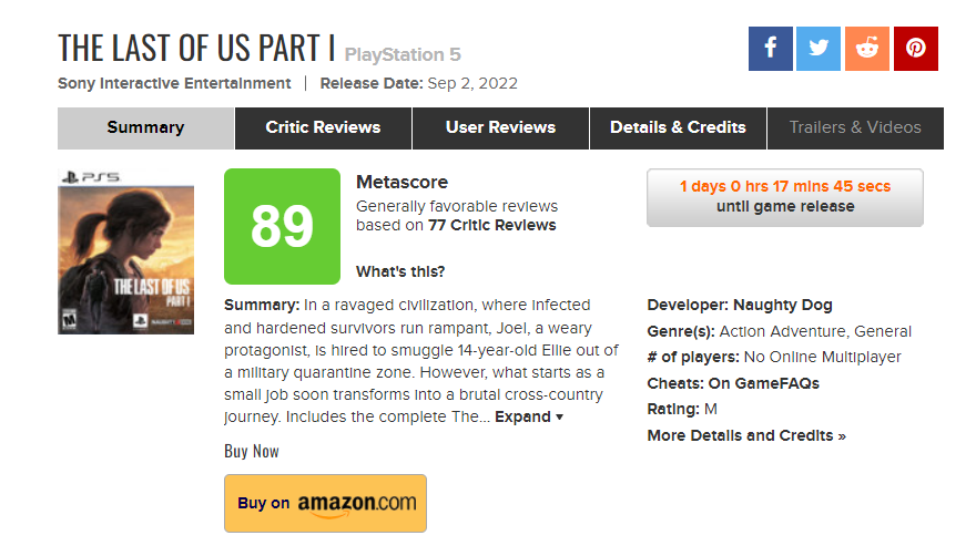 《最后生还者:第一部》M站评分现已解禁,目前媒体均分89分。77家媒体给出了好评,4家媒体给出了中评,没有媒体给出差评。