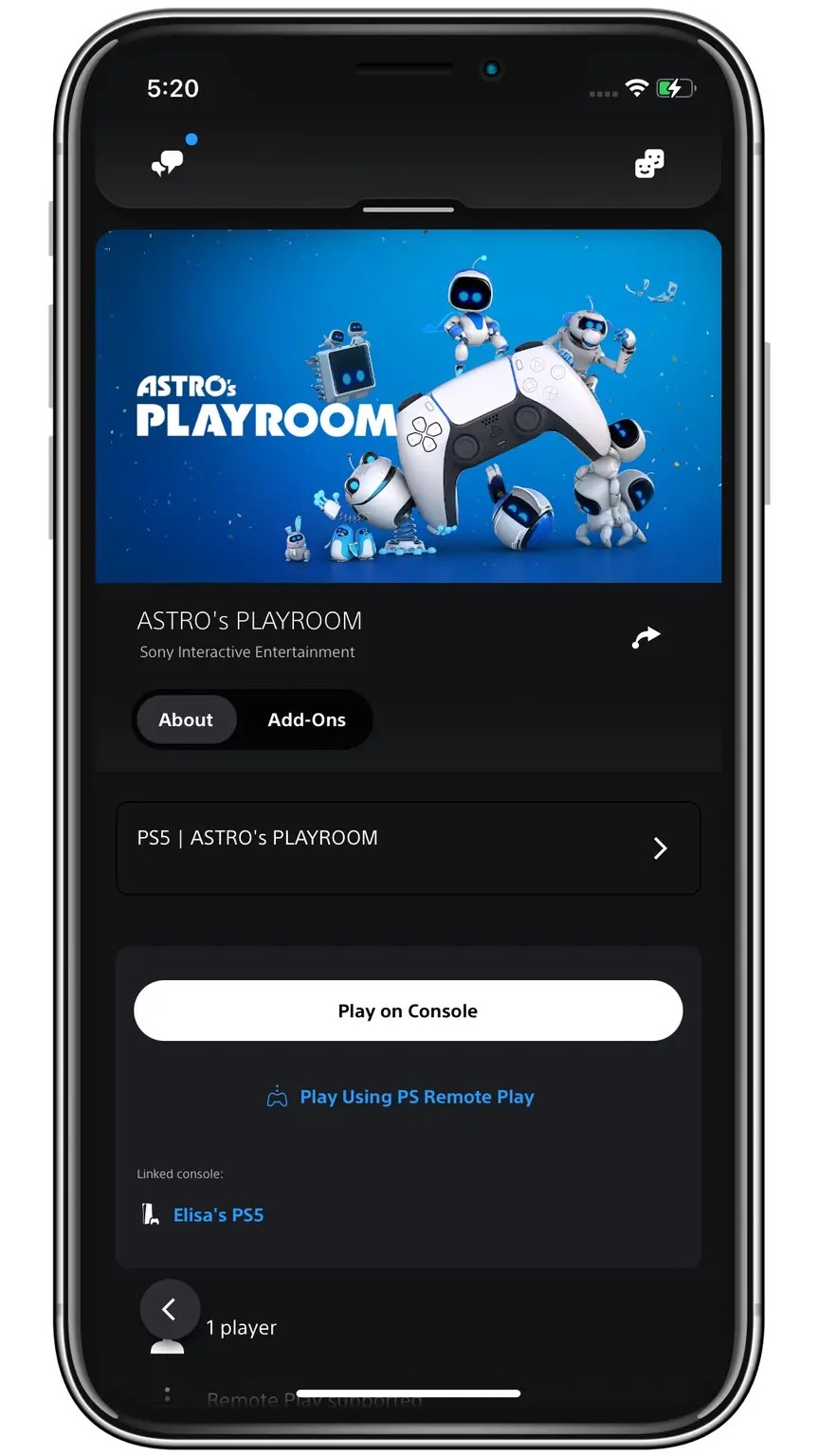 首先,请确保PS App已链接到您的PS5主机,并且您的主机处于休眠模式。然后,选择 PS App 游戏中心上的“使用 PS Remote Play 玩游戏”图标,PS Remote Play 应用将自动启动该游戏。要享受此功能,请确保PS应用程序和 PS Remote Play应用程序都安装在您的手机或平板电脑设备上。