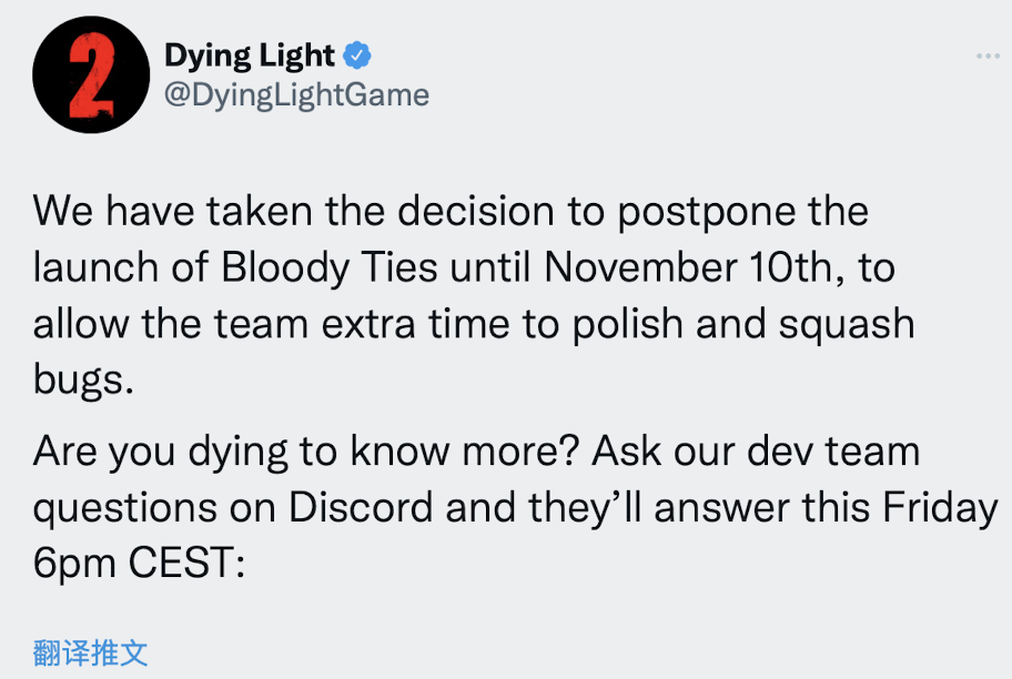 今日,《消逝的光芒2》开发商宣布,原定于10月13日推出的DLC—《血系》(“Bloody Ties”) 延期至11月10日推出,以便团队有更多的时间来完善游戏排除BUG。