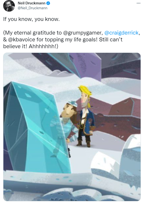 近日,顽皮狗总裁尼尔发推确认自己参与了《重返猴岛》的配音,虽然戏份相当少,但对于他来说意义似乎十分重大。