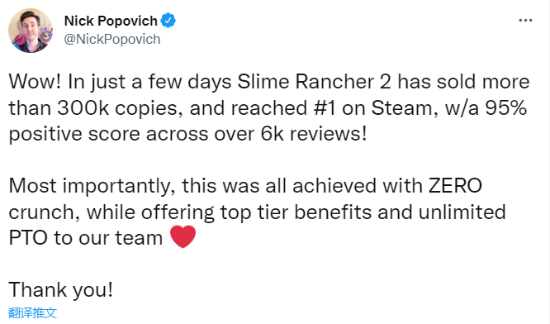 《史莱姆牧场2》制作人Nick Popovich今日发布推文称,游戏目前销量已经突破了30万。