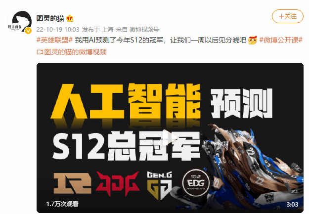 继成功预测4套高考作文题目后,博主图灵的猫再度发布视频预测英雄联盟S12冠军,AI预测S12冠军为RNG,但若考虑上身体因素后,结果则变成了JDG。
