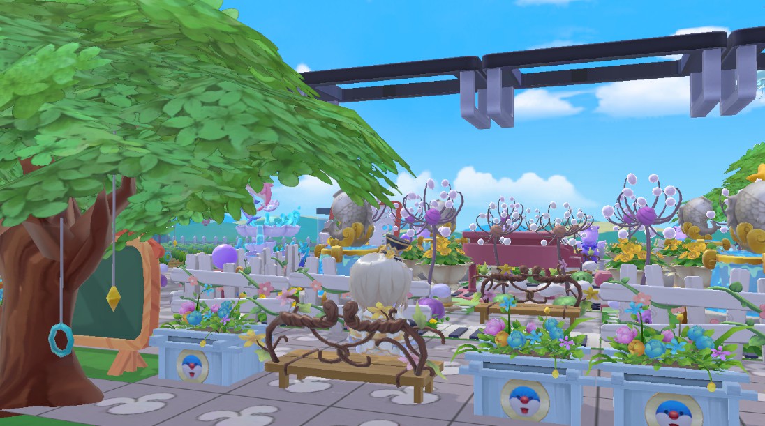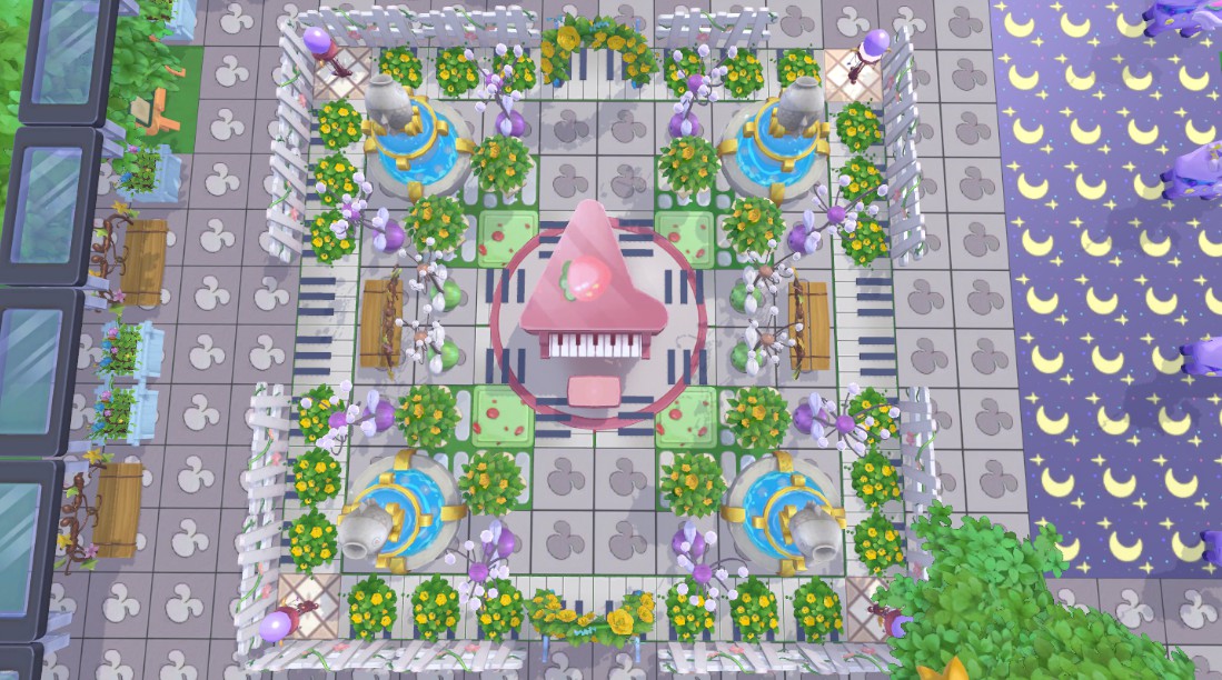 在小摩尔@你的小肥仔吖 家园的中心,是被栅栏包围的小型露天演奏区。区域的四角搭配了相应数量的喷泉和花丛,中间的经典款草莓三角钢琴妥妥占据着C位。